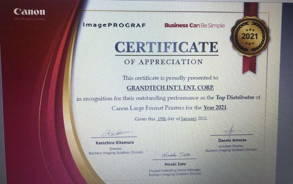 At the recent kick-off, GRAND TECH INT´L. ENT. CORP. was presented a CERTIFICATE OF APPRECIATION in recognition for their hardwork and outstanding performance as the TOP DISTRIBUTOR of Canon Large Format Printer for the Year 2021.